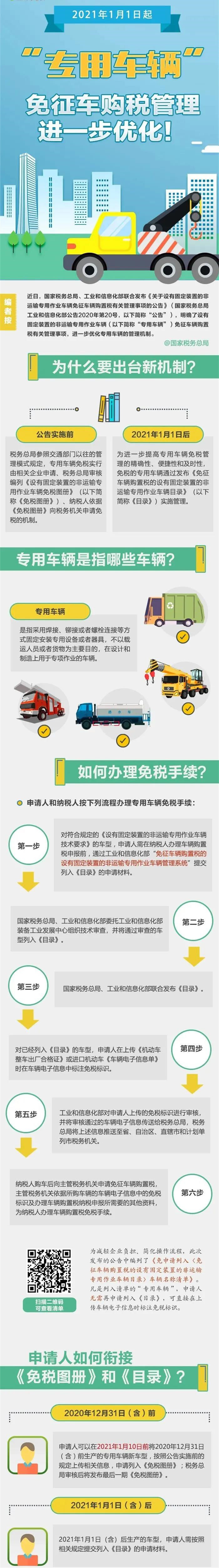 2021年1月1日起,我國將對免征車輛購置稅的設有固定裝置的非運輸專用作業車輛(以下簡稱“專用車輛”),由原來的“《免稅圖冊》管理”改為“《目錄》管理”。為確保該項機制順利實施,稅務總局、工信部日前聯合發布《關于設有固定裝置的非運輸專用作業車輛免征車輛購置稅有關管理事項的公告》(國家稅務總局 工業和信息化部公告2020年第20號),明確若干管理事項。消防車屬于專用車的一種,也屬于免征車輛,以下要點需要納稅人關注↓